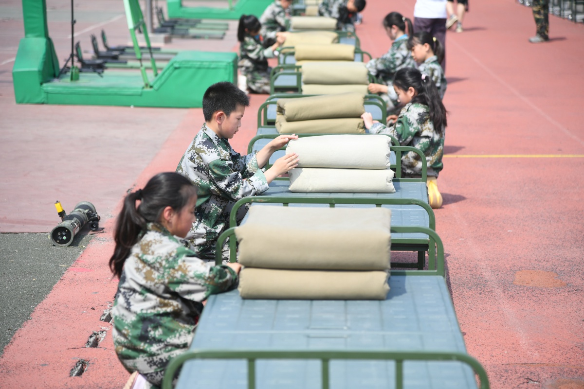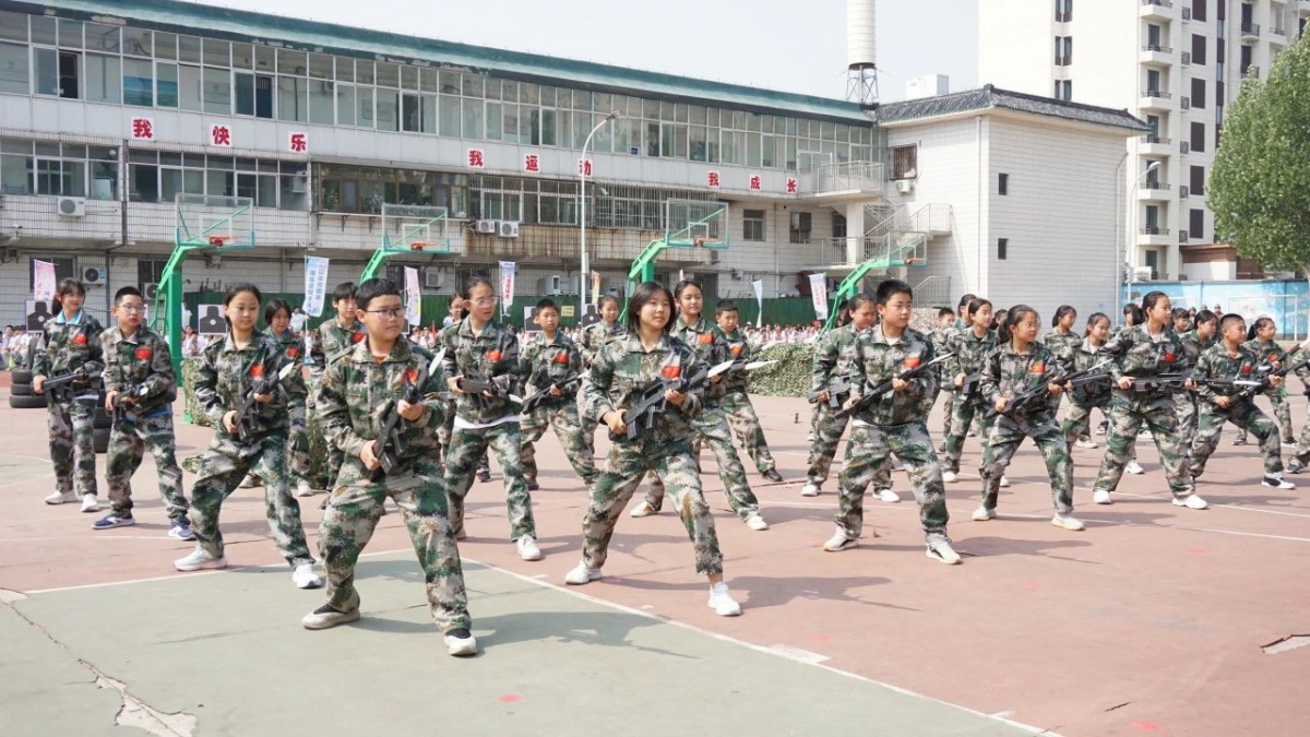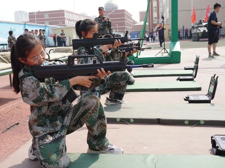 国防实践展示震撼登场:捕俘拳、刺杀操方阵、枪械拆解演示,内务整理等;无人机操控编队、红蓝对抗演练、激光枪精准“射击”,学生佩戴护具分组竞赛,在科技中感受国防现代化.